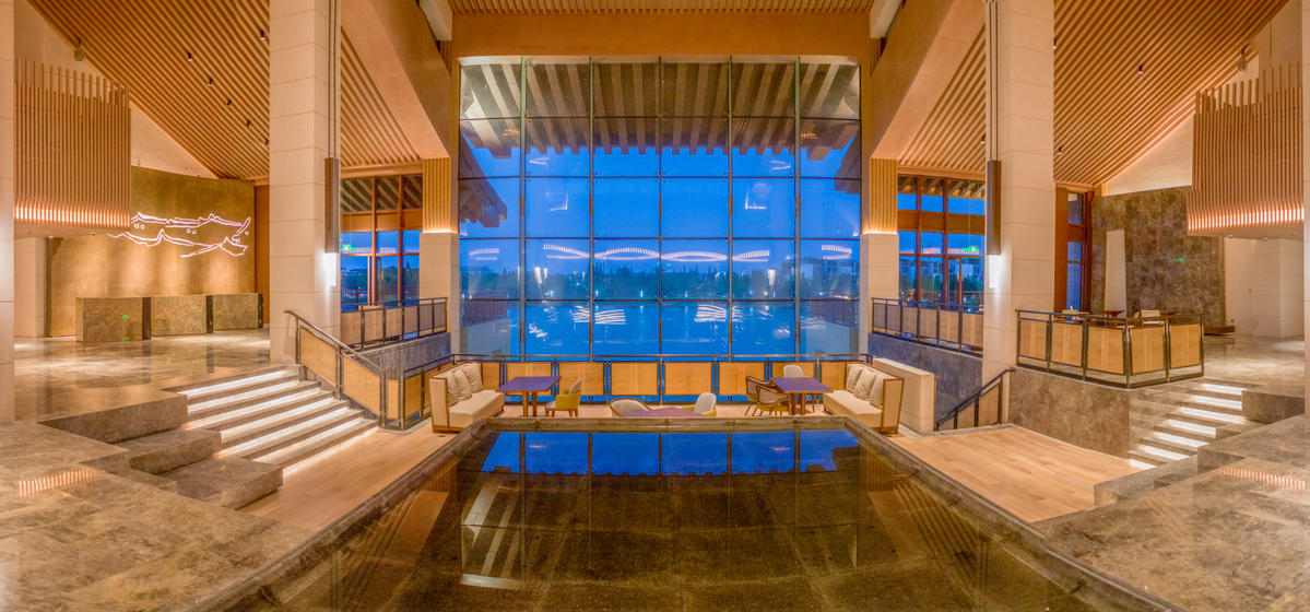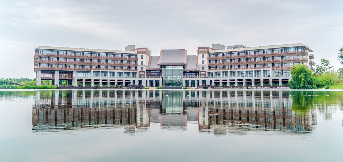 This hotel’s construction design is based on modern art, and integrated with the surrounding lake and ancient water town.
