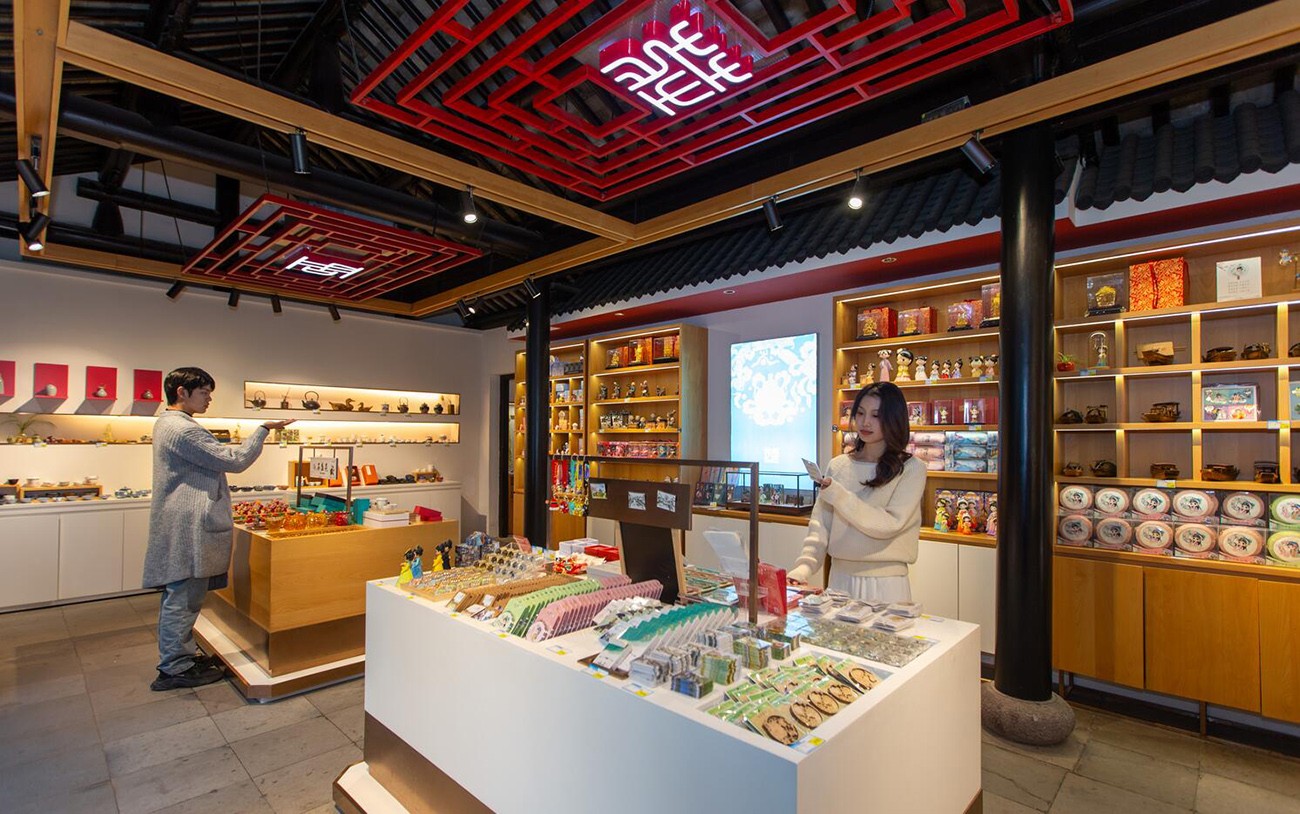 This cultural and creative store offers a variety of Jiangnan water town style products, including tea cups, embroidery, Kunqu opera and Zhouzhuang stoves.